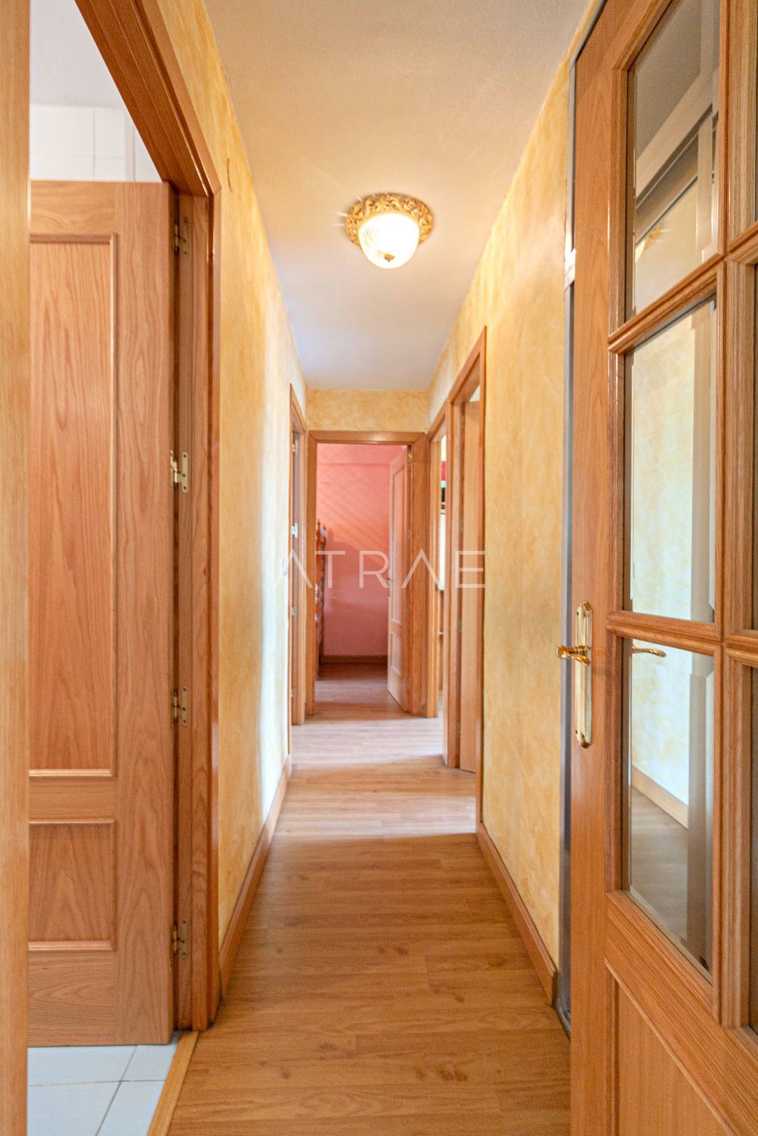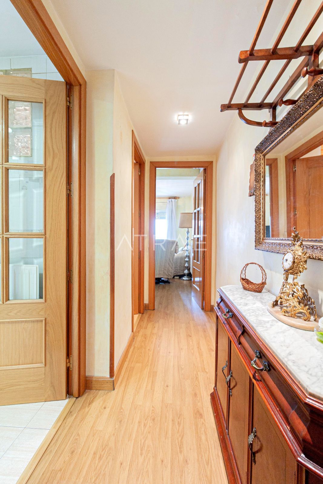 La vivienda dispone de 96m2 construidos, de los cuáles 86 son útiles, distribuidos en recibidor, cocina independiente, salón-comedor, 3 dormitorios (4 en origen) y dos cuartos de baño completos. Dos de los dormitorios comparten un armario empotrado, con acceso desde ambas habitaciones, y en el pasillo se encuentra un segundo armario empotrado. Desde el salón se accede a una terraza acristalada, con vistas despejadas.