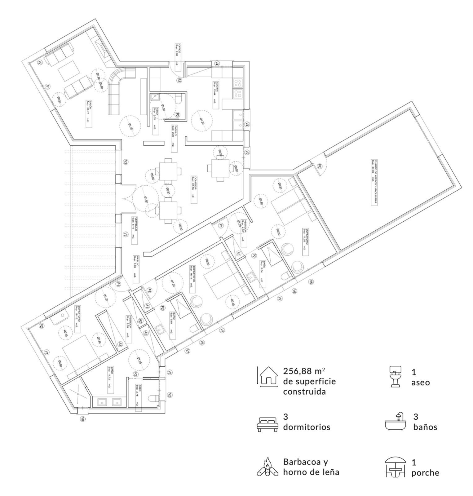El complejo lo forman un edificio principal en el que se sitúan 3 de las habitaciones con cuarto de baño en suite, un gran salón comedor, cocina y aseo; y 2 bungalows independientes con 2 habitaciones cada uno, salón, cuarto de baño en suite y terraza propia. Además, hay varios espacios de almacén y despacho, así como una gran despensa en la cocina.